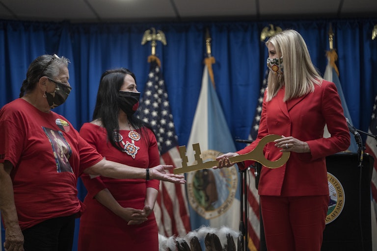 The picture tells a nice story: Ivanka Trump—smiling with a big golden key in hand—stands alongside assistant secretary for the Bureau of Indian Affairs Tara Sweeney, Lower Sioux Indian Community Vice President Grace Goldtooth, and Interior Secretary David Bernhardt. They are there to mark the opening of an office in Bloomington, Minnesota, dedicated to cold cases in Indian Country. Specifically, the office is designed to address the Missing and Murdered Indigenous Women and Girls, or MMIWG, crisis, and is one of seven such offices that the Trump administration has said it will open across the country, each the result of an executive order the president signed last November. On its face, it’s an urgent commitment in response to years of federal neglect.