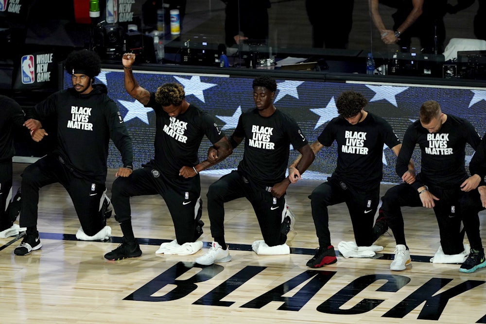 It’s even more convenient that, after negotiations between players and owners about the bubble broadcast infrastructure, the league has instituted a series of decidedly liberal messaging gestures for this one-off pandemic season. The resulting rhetoric is not exactly the stuff of Frantz Fanon. In fact, it’s all rather mushy and hollow: “Black Lives Matter” is perhaps the most radical of the slogans that the NBA has permitted players to wear on their jerseys, along with some of the more popular protest chants—“Say Her Name,” “How Many More”—on the approved list of in-game political rallying cries. Beyond these feints, there is little else to represent the well-polling concrete policy goals of the movement the league is gesturing toward. The league’s stars aren’t exactly leading a teach-in on ending qualified immunity for police or law enforcement accountability; the disarmament, defunding, and abolition of police forces have also been deemed too spicy. Most of the jersey messages are so bland and unspecific that it seems wrong to even call them political: “Equality,” “Vote,” “Peace,” and “Education Reform.” But this is all political enough for the right.