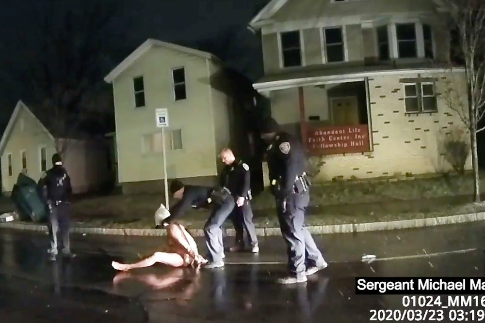 On March 23, Joe Prude of Rochester, New York, called 911 because his visiting brother, Daniel, had fled his home while experiencing a mental health crisis. When police officers responded, they found Daniel Prude in the street, naked and bleeding. He obeyed their commands to lie on the ground—the temperature was just above freezing, as snow fell—and allowed himself to be handcuffed. The officers placed a “spit hood” over Prude’s head. One officer pressed Prude’s head and gripped the hood, while another kneeled on his back. Within a few minutes, he had stopped breathing.