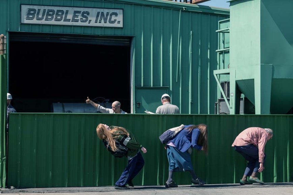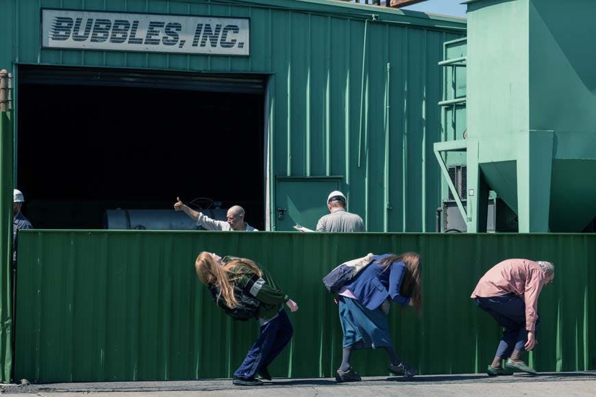 The center of the film is Old Dolio (Evan Rachel Wood), a young woman living with her parents, Robert and Theresa (Richard Jenkins and Debra Winger), in a barely habitable basement office space underneath a soap factory. Several times a week, the three of them pitch in with giant mops to fight back an avalanche of pink bubbles pouring from the floor above, a surrealist touch that recalls the wobbly, colored shapes that float across the screen in some of July’s early shorts. Old Dolio’s voice is low and creaky, as if from disuse, and her long, dirty-blonde hair hides her, evoking a prettier Cousin Itt.