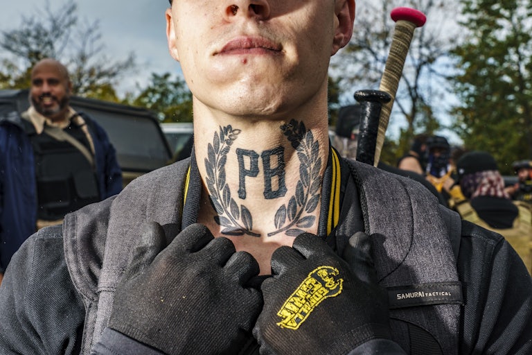 In Jenkins’s own footage of the incident, just after McInnes slams the protester’s phone onto the pavement, the Proud Boys founder can be seen delivering a fist bump to the late communications strategist for Project Veritas, Stephen Gordon. He then shakes hands with a cheering spectator named Matthew Tyrmand, a Polish nationalist who has served for many years as a conduit between the European and American far right, as well as a director on the Project Veritas board.