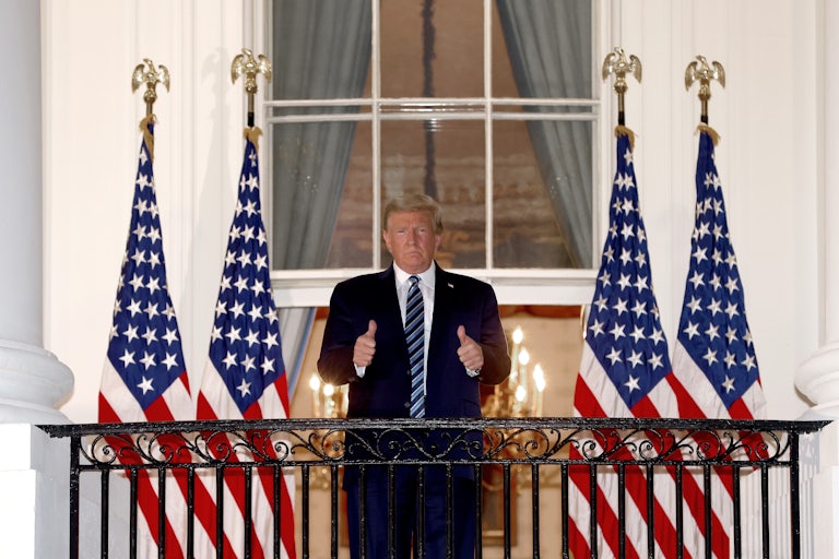 With a month to go before the November election, Donald Trump has returned to the Covid-19 message he, his administration, and his allies pushed in the early spring. “Don’t let it dominate you,” Trump said in a video released Monday evening, shortly after he left Walter Reed Medical Center, where he had been treated for several days for Covid-19. “Don’t be afraid. You’re gonna beat it!” Channeling Evita, he waved, maskless, from a White House balcony, posturing that he had beaten the virus despite the fact that he was both very contagious and apparently very symptomatic.