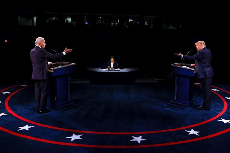 There was a small window reserved in the debate for the candidates to discuss jobs and the economy (designated “American Families” on the event’s official table of contents), in which Biden criticized the president’s inability to wrest another stimulus bill from Congress, referred to health care as a right while pledging to institute a public option, and advocated a $15 minimum wage. But most of the bread-and-butter talk quickly vanished in the froth over whose overseas business dealings were sleazier, how China might best be vanquished, and whether Trump was the least—or, in fact, the most—racist person in the room. There was no proposal to reinstate the weekly $600 unemployment insurance boost, even though the unemployment rate remains around 8 percent, no mention of the still-spiking opioid deaths or the shortcomings of the Purdue Pharma settlement. At one point, Trump lambasted Biden for invoking “worried families sitting around the kitchen table”; the crassness of that particular sting was only somewhat lightened by that fact that Trump’s accusation—that Biden had mentioned working families as a cynical ploy to change the subject from his son’s sundry controversies—appeared to be true.