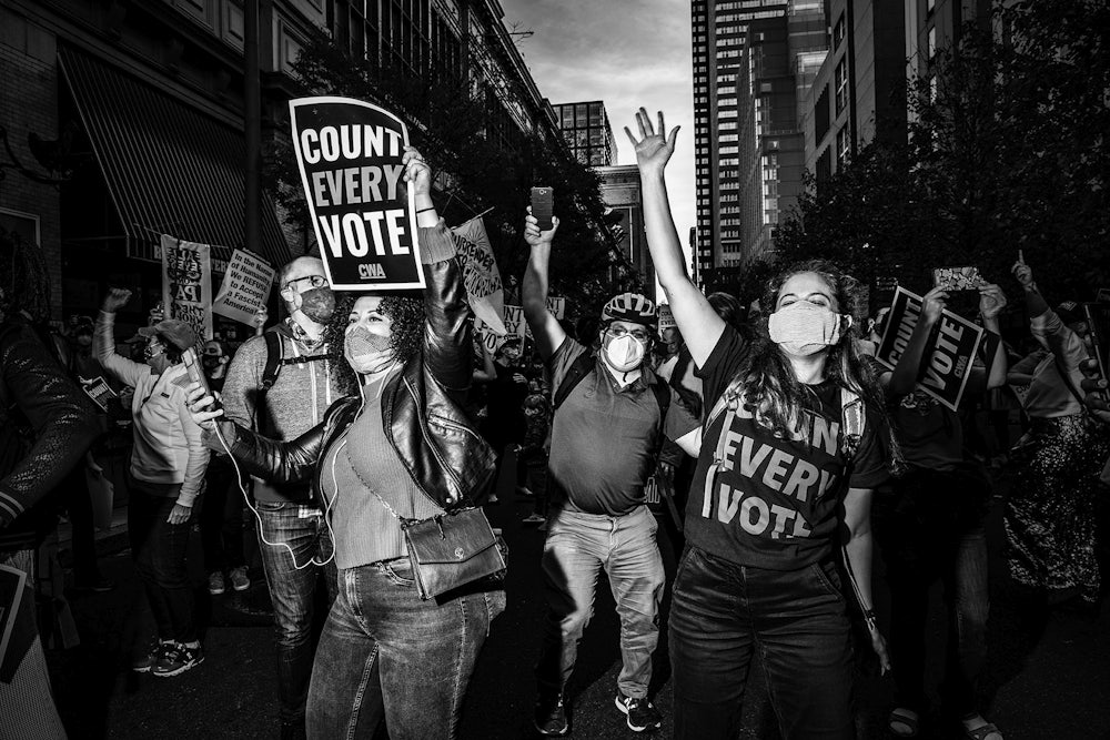 Looking to ensure all those votes would be counted in the long lead-up to Election Day, local organizers and a statewide coalition, Pennsylvania Stands Up, have been in touch with a number of national election defense outfits comprised of the Working Families Party; the Sunrise Movement; the National Domestic Workers Alliance; and national unions, including SEIU as well as Indivisible, among many other groups that have been providing support to protests around the country. On Wednesday, one such outlet called Protect the Results—a massive coalition of 165 organizations—announced it would “not be activating the entire national mobilization network” for demonstrations that had been planned in advance but remained “ready to activate if necessary.”