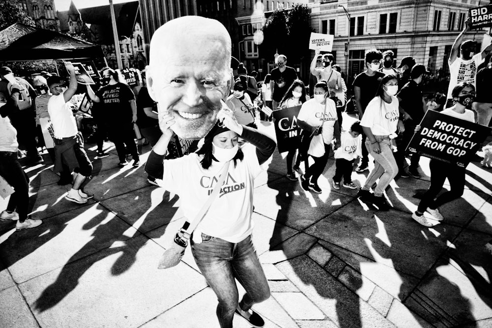 Peterson caught a mother and daughter in an emotional moment as the crowds that had gathered in McPherson Square Park in Washington, D.C., watched Biden give a speech on a big screen. “It was just incredible, the young girl, how concentrated she was,” Peterson says. “It seemed like she was trying to comfort her mom in that moment.”
