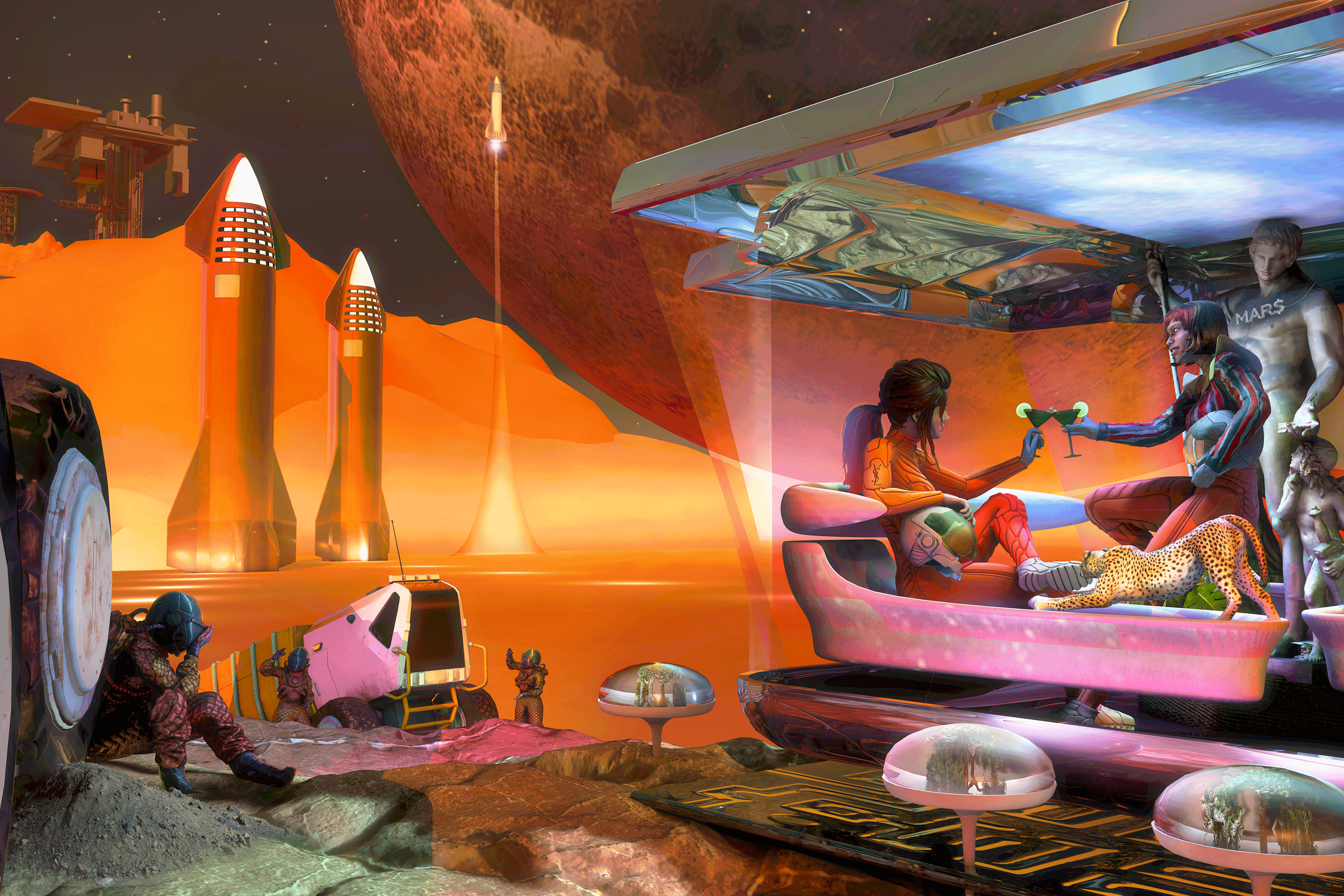 Musk was joined by Amazon CEO Jeff Bezos, who’d dreamed of going into space since his Star Trek–addled boyhood. In 2000, Bezos founded his own spaceflight firm, Blue Origin. But Bezos’s view wasn’t quite the sunny New Frontier ethos of Gene Roddenberry; it had a distinctly Malthusian cast. Humanity, he argued, needed to escape the planet in order to save it from utter devastation; he envisioned one day building mammoth space stations complete with farms and trains. By 2018, Bezos was—like Musk—landing lucrative government contracts, such as $500 million from the Air Force to create a rocket.