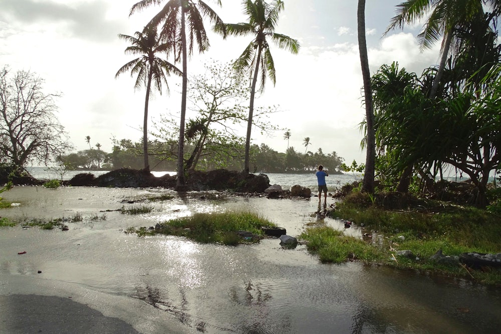 Reef islands grow vertically too, on a smaller timescale. I learn that beach sand, or sediment, which is usually coral but also other biological material, erodes, shifts, and rebuilds elsewhere—and not always where humans want. During the king-tide season, I see where waves dump bits of coral, shells, coconut husks, pandanus branches, and garbage onto the road. I don’t fully understand, at the time, that this flooding is actually building the island, not sinking it.