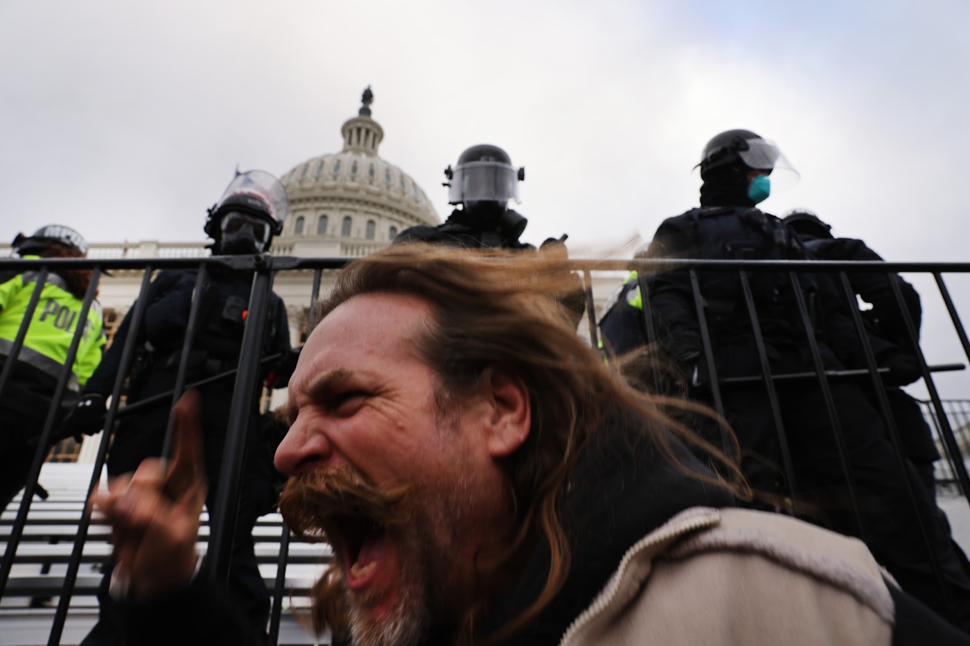 President Trump solicited the march to the Capitol. He would be with them, he said. Instead, he abandoned his cult within minutes: The presidential motorcade arrived at the White House just as his supporters rushed police lines separating them from the joint session of Congress that had just begun the process of accepting each state’s electors. Once these “patriots” advanced on them, Capitol Police officers launched volleys of pepper spray at the crowd, who carried red MAGA flags and black-and-blue Back the Blue flags. Some turned metal barricades vertically, while others clung to the walls surrounding the Capitol, trying to make it over. By then, people had fully swarmed into the building, and Congress suspended its session. A man with a Confederate flag marched through the halls, while another, known as the QAnon Shaman, stood outside the Senate chamber. Others stayed neatly corralled by two red velvet barriers while CNN broadcast their procession. The CNN host announced an “armed standoff” at the door of the House floor. At 2:47 p.m. a HuffPost reporter posted a photo with the caption, “They’re in the chamber. One is up on the dais yelling ‘Trump won that election!’ This is insane.”