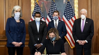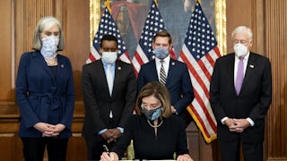 Then this January 6, the American swastika made its famous appearance inside the Capitol building in Washington, D.C., waved proudly as a flag of conquest by insurrectionists seeking to lynch members of Congress—and Vice President Mike Pence—unless they overturned the plain will of the people and kept on Donald Trump as president. The mob was operationalizing a belief affirmed by a majority of the Republican members of Congress (140 out of 211 House members, eight of 53 senators) that America’s reactionary minority must rule by right. That’s a tradition that dates back to the founding of our never-quite-United States.