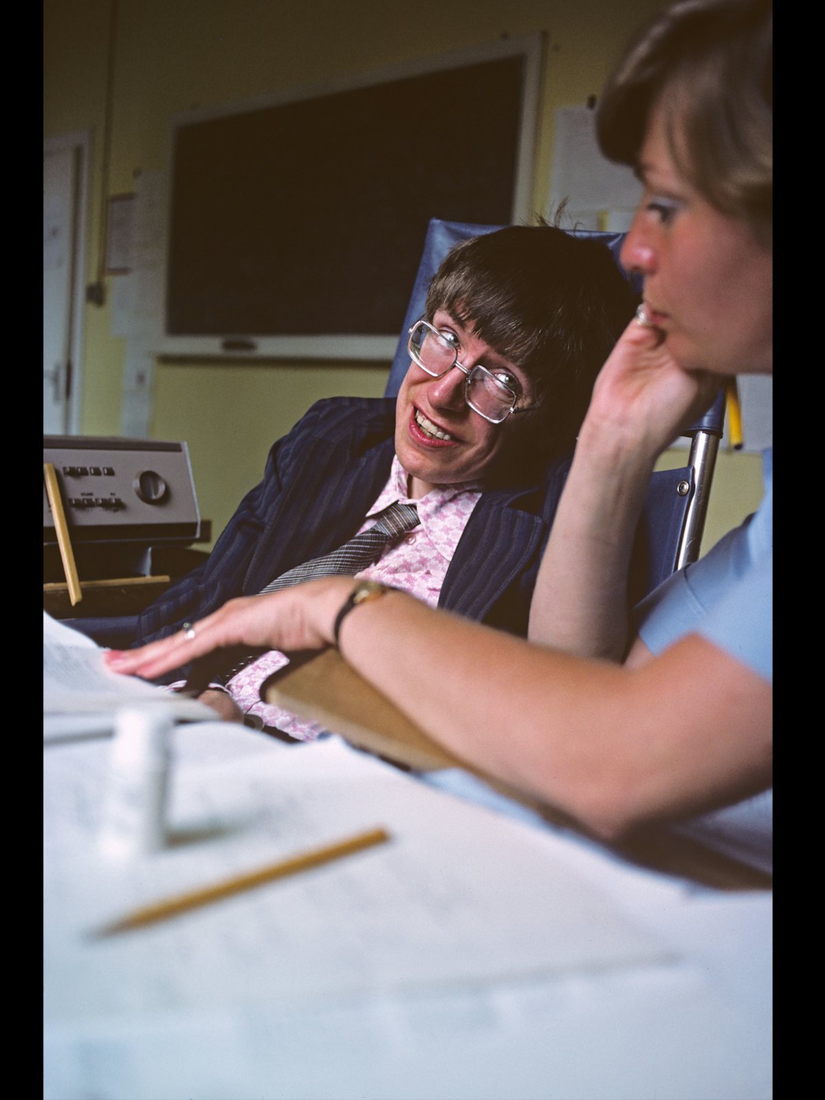 This tale, told in Seife’s new book, Hawking Hawking, expresses several things at once. It visits Hawking just as he is transitioning into a rare planetary superstardom—one touched off by A Brief History of Time, which is now thought to have sold at least 10 million copies. It captures Hawking’s thirst for that kind of recognition—or, at the very least, his unalloyed delight at securing it. More than anything else, the story underscores the sheer improbability of this entire affair. People had poured into an auditorium to hear an immobile man with a computerized voice speak about bewildering theories in physics—a prospect so audacious and remote, at most other times, that Hawking himself was unprepared for it.