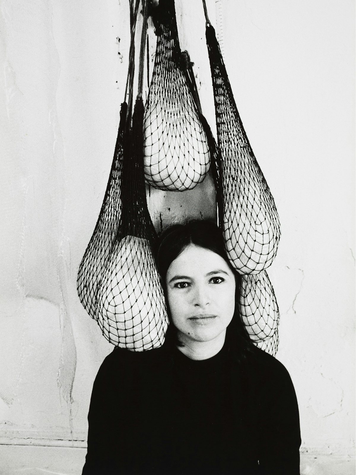 Hesse’s and Wilke’s experiments are captured in real time, in fabulous photos included in the exhibition catalog: Both artists can be found standing or kneeling among liquid latex, fiberglass, and eccentric found objects. In the late ’60s, the appearance of such radical, unwieldy materials was a sure sign that minimalism—the reign of rigid, “inorganic” geometric forms—was ceding to a more “organic” aesthetic. The purities of shape (invigorating or dull, depending on your disposition) were being laid to rest in favor of more “uneven” and conspicuously process-driven art. Where Donald Judd’s boxes might feel shaped and lacquered by platonic form, the work of artists like Hesse and Wilke belonged to the human. Their work is not a formal given but rather the scene of a visible investigation.