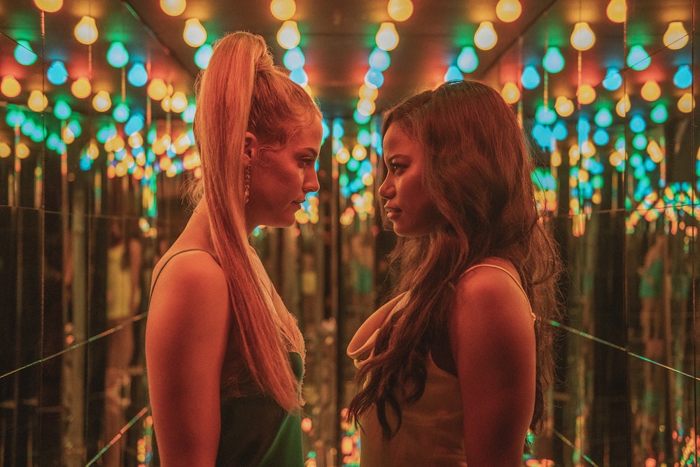 The movie begins in the same place as its source. “Y’all wanna hear a story about why me and this bitch fell out?” asks Zola, here played by Taylour Paige. “It’s kinda long but full of suspense….” Like the Twitter thread itself—which opened with four photos of Zola and the blonde in question posing together—the film has an upfront appeal based on the electricity between the two women, even though we’ve already been warned that things are about to go drastically wrong.