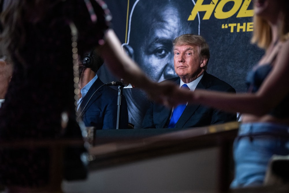 Then, not to be outdone, he provided pay-per-view color commentary on a TikTok competitor for a fight—if you can even call it that—between a nearly 60-year-old Evander Holyfield and 44-year-old MMA fighter Vitor Belfort. Trump mostly talked with his co-commentator, excitable lackwit son Donald Jr., about the good old days, Holyfield’s once shockingly speedy punches, and Larry Holmes’s immaculate left jab. On Saturday, the 58-year-old Holyfield could barely punch and was roundly pummeled by his comparatively sprier opponent, in a match that should have been disallowed via the Geneva Convention.
