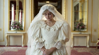 It’s hard to know what Spencer would be without its perfect costumes and soundtrack. The film’s costume designer, Jacqueline Durran, who began her career in wardrobe on Eyes Wide Shut and has won two Oscars, said in an interview with Entertainment Weekly that she and her team “narrowed it down by having a time frame, which ran somewhere between 1988 and 1992,” and only strove for total accuracy with a few of the outfits, like “the red polo-neck and the dogtooth skirt that she wears the second costume into the movie,” and “the bomber, the blouson jacket that she wears at the end,” from a brand called Mondi, identical to the real one. Many of the outfits feel familiar even if they’re actually Durran’s creation, like the yellow sailor outfit and a wedding dress that appears in a flashback scene—it’s not the real one, but it has the big puffy sleeves and dwarfing veil that matter.