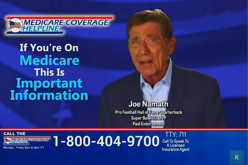 The TV campaign, which first aired in 2018 and stars 78-year-old Joe Namath, is for the Medicare Coverage Helpline. With a crinkled smile, Namath lists a handful of health care benefits—from no co-pays to home-delivered meals—intended to attract callers on Medicare. The kitschy campaign reaches peak saturation each year during the annual open enrollment period, with newer ads featuring Star Trek’s William Shatner and Jimmie Walker from Good Times.