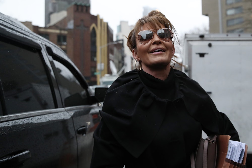 What Palin hasn’t possessed in recent years is what passes for the real coin of the realm on the American right: a hot, shiny, simmering grievance with the titans of the mainstream media. Palin v. New York Times is, essentially, her latest appearance on a game show—an attempt to thrust herself back into the spotlight, this time with a hook that might lead to a career revival. The outcome of the trial was never the point. Palin can credibly return to her favorite hobbyhorse: the lamestream media as her persecutor.