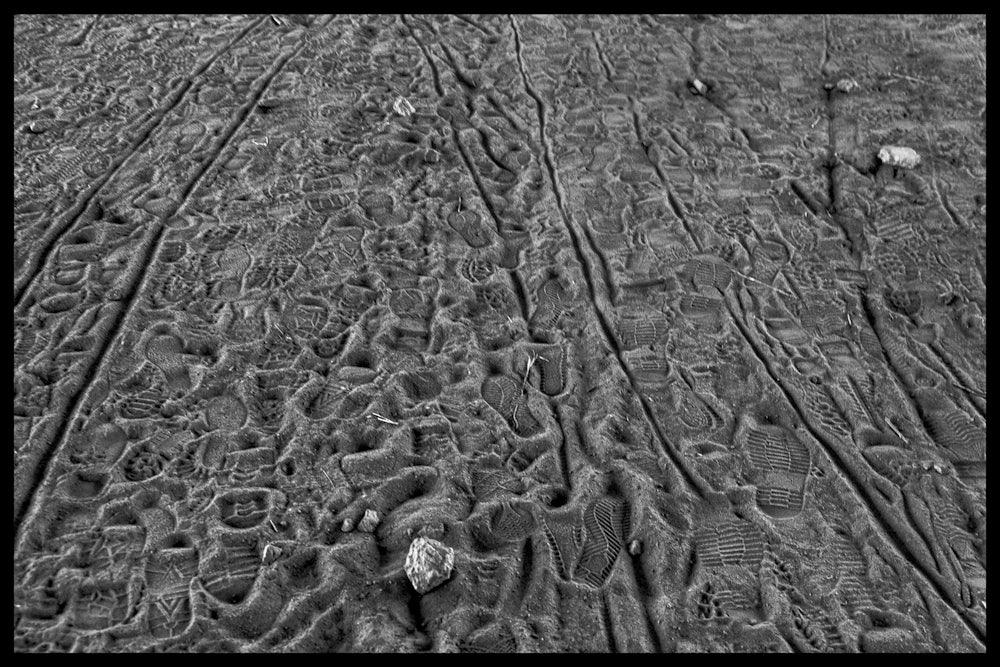 Look at these photos of frozen sand that preserved the footprints of those who escaped. It is like Pompeii without ash—traces of a civilization in flight. You see, amid these embalmed steps, the tracks of what seems like bicycle tires but then you notice they are in parallel pairs, a few feet apart. You look at another picture and you realize what has made these tracks: baby strollers that have been abandoned. Did parents break into a run, grabbing their infants from their strollers, after a bomb fell nearby, too close? Was the path ahead impassable on wheels, so infants had to be carried?