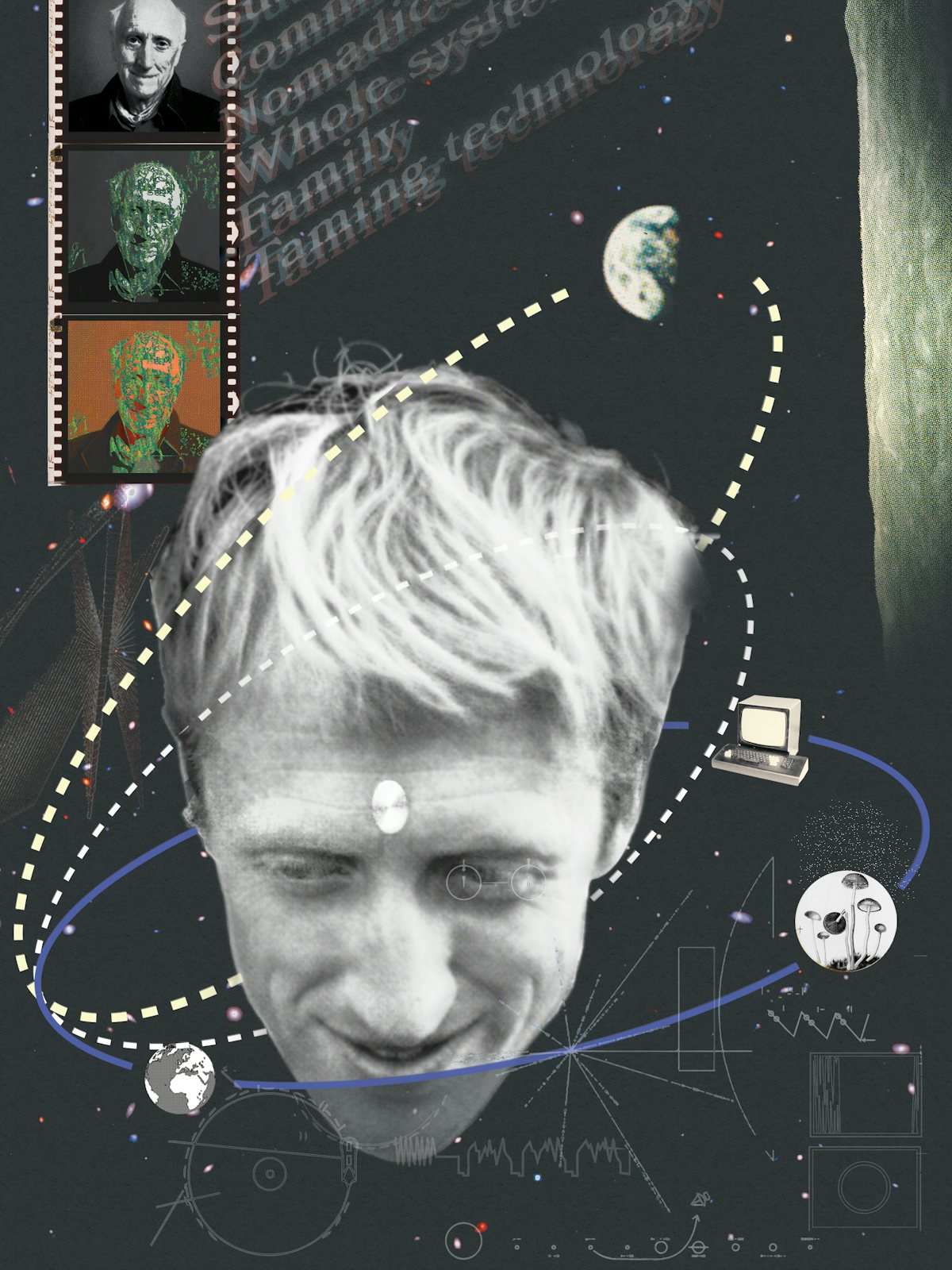 The brightest thread running from Brand’s youth to his later years may be the individualism he articulated in a diary entry from 1957, when he was still a teenager. Should the United States and the USSR come to blows, he told himself, “I will not fight for America, nor for home, nor for President Eisenhower, nor for capitalism, nor even for democracy. I will fight for individualism and personal liberty.” Such Cold War self-reliance was complicated, however, by Brand’s classes at Stanford, where he majored in biology: “At long last,” he wrote his parents, “I’m getting what I was looking for in biology: ecology, ‘the interrelation between living organisms and their environment ...’ This is the ‘living whole, not the dead parts.’” Much of the organizing tension of Brand’s life—as a promoter of environment and community, on the one hand, and of technologically equipped personal freedom, on the other—comes from his efforts to square his youthful individualism with the ecologically minded holism he discovered in college. The Whole Earth Catalog would call for planetary life to be seen as one integrated system and, at the same time, seek to release its readers into splendid isolation, through “access to tools for self-dependent self-education, individual or cooperative,” as early copy had it. The question has always been whether these two aims were complementary, as the Catalog suggested without really stating as much, or contradictory.