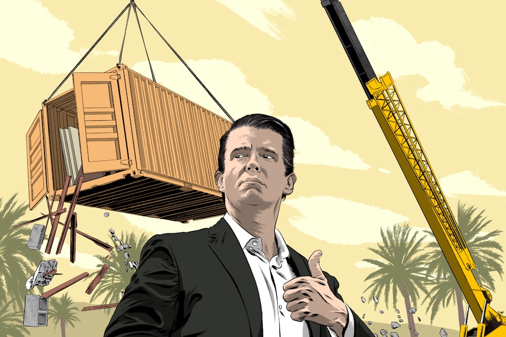Tactic Homes wired about $115,000 to Titan Atlas for three housing kits; the company planned to have the homes built and to use them as models to get financing from sovereign wealth funds—seeking good P.R. following the Arab Spring protests—to order thousands more. But when the shipping container arrived, Perez’s French-Tunisian partner wrote to Blackburn and Don Jr. complaining that the container was filled with “garbage,” adding in another email that there were “no windows, no doors, no cabinets, no plumbing, no electrical, no cables, no reinforcing bars.” Even after phone calls and visits to Trump Tower by Perez, emails that I later obtained show Trump Jr. refusing to budge, calling the allegations “nonsense” in a later email to Perez. In reality, the Tunisia shipment was one of multiple instances where the shipments ran into problems.