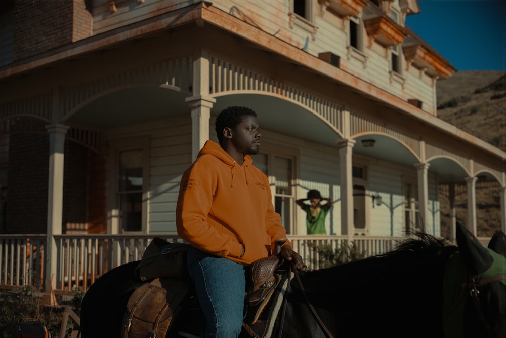 The film moves along parallel paths, with one narrative focused on the Haywood siblings and their struggling animal husbandry business and the other on Ricky “Jupe” Park (Steven Yeun), a former child actor whose life is marked by a tragic and traumatic event from his past. Jupe and his family now run a theme park and petting zoo called Jupiter’s Claim that sits in the Santa Clarita Valley, adjacent to the Haywood horse farm. The name Jupiter’s Claim plays on two of Hollywood’s most enduring notions of the frontier: the infinite and sterile grandeur of outer space and the pristine vastness of the American West. The tawdriness of Jupiter’s Claim makes it clear that Peele rejects the premise that lies at the heart of the idea of the frontier: an unspoiled landscape that offers rugged and determined white men the opportunity to make their fortune and remake their identity by imposing their will on the environment. OJ Haywood’s physicality and stoic yet sensitive persona might recall Clint Eastwood in Sergio Leone’s The Good, the Bad and the Ugly (1967), but OJ’s generational connection to both the land and the film industry makes him unwilling to indulge in romantic and self-serving notions of transcendence. OJ just wants to take care of the horses he raised with his father, but he’s reluctant to make this easier by reminding the production companies that hire him and his horses that he is the inheritor of a venerable Black business.