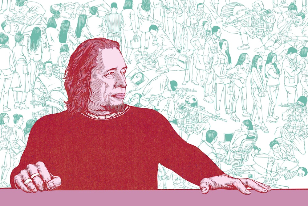 English-language critics tend to stress this aspect of Sorokin’s writing—the cannibalism, sexual violence, shitting, and shit-eating—while seating him within the drab furniture of Russian political punditry. In their rush to present him as shocking or useful, and therefore worthy of our attention, they auto-tune the cacophony that is his work’s defining feature. Sorokin has been described, variously, as the “shock jock of Russian letters,” “one of Putin’s harshest critics,” and a “notorious provocateur.” A recent profile in The New York Times characterized him as a literary dissident whose “portraits of Russia as a decaying former empire that’s sliding backward under a militaristic, violent and repressive regime have come to seem tragically prescient”—a kind of sexed-up Solzhenitsyn. Elsewhere he’s been compared to the Marquis de Sade, Georges Bataille, William S. Burroughs, Will Self, and Michel Houellebecq.