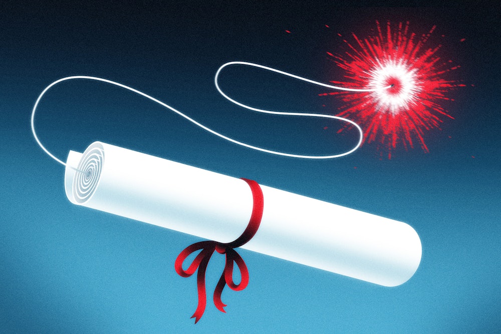 At first, the existence of the student loan debt crisis might seem to cut against Bunch’s notion that a college education is the dividing line of economic prosperity in the twenty-first century, since, if college comes with a mountain of debt, graduates emerge from their degrees less well off than they started. Yet it’s more complicated than that. For millions of young people entering the labor market, the irreplicable benefits of a college degree have more than justified the financial risk of taking out student loans. The stereotypical image of the graduate student in Andalusian literature who went a quarter-million dollars into debt only to be shocked at the lack of good-paying jobs in her field might be a good rhetorical punching bag for the right, but almost everyone who takes out loans to attend college is making a rational calculation about their prospects for entering the white-collar labor market. Millennials without bachelor’s degrees make only 62 percent as much as those with bachelor’s degrees, and the unemployment rate for millennials with a high school diploma during the Great Recession was more than three times as high as those with college degrees.