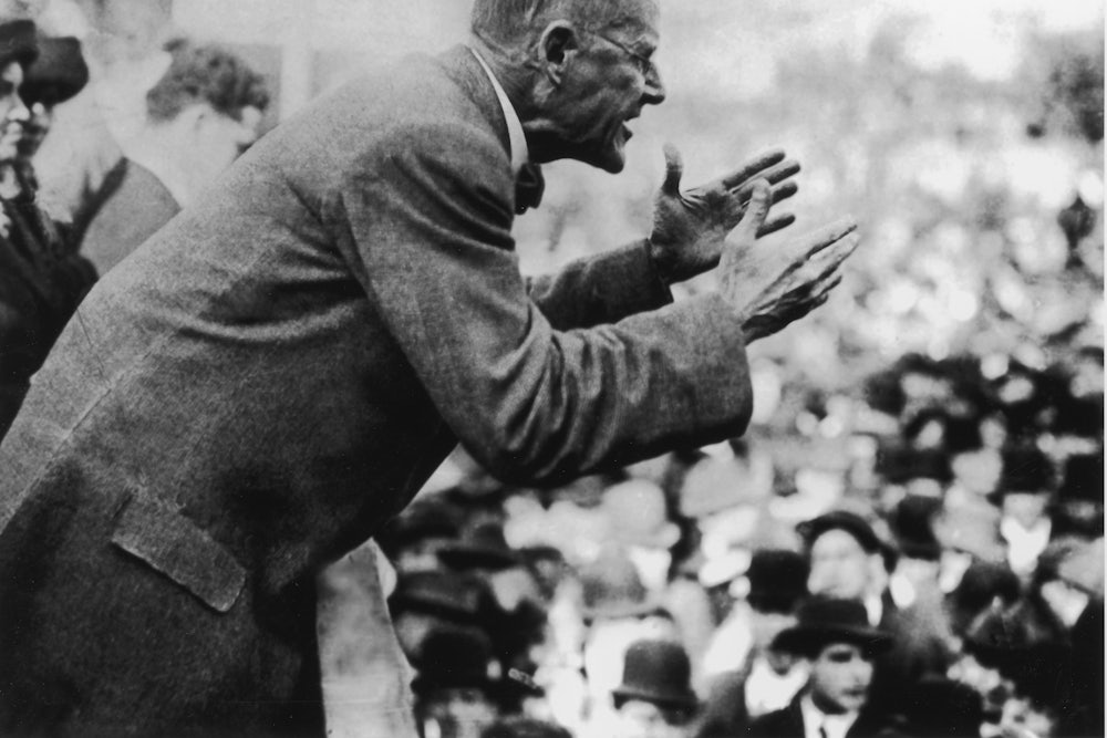 The anti-German, pro-war fervor was only part of the story, however. Hochschild makes clear that the Espionage Act was equally conceived as a “club to smash left-wing forces.” A vast network of spies and private detectives went to work infiltrating workplaces, union halls, and leftist gatherings in the hope of hearing disloyal talk and sowing disagreement. Strikes, work stoppages, and picket-line demonstrations were suddenly seen as evidence of enemy infiltration and suppressed even more violently than before. Prominent leaders and speakers on the left were surveilled, harassed, and frequently imprisoned. Most shockingly, Wilson’s presidential rival, the Socialist Party leader Eugene Debs, was arrested and jailed.
