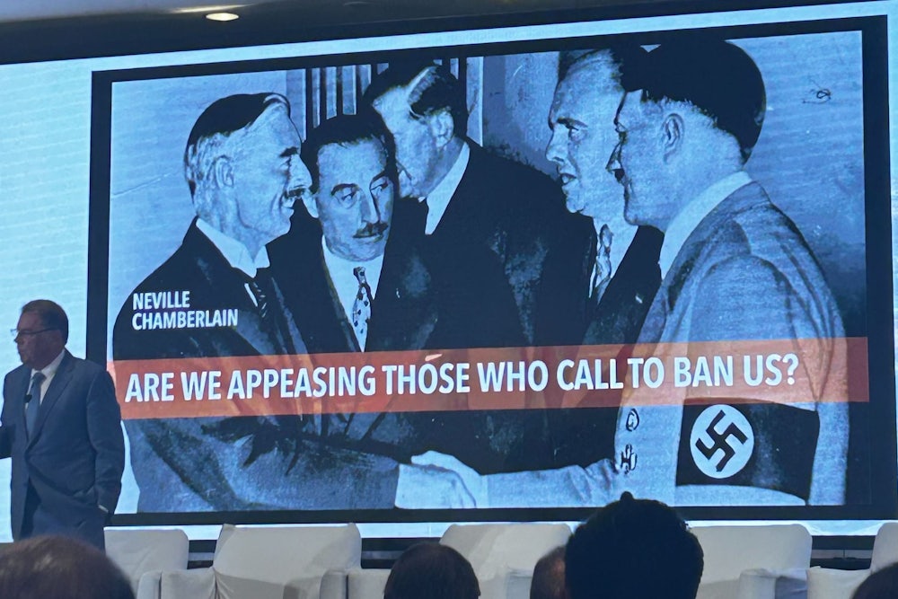 As the slide behind him—complete with a picture of Chamberlain shaking hands with Hitler, swastika prominently displayed—asked, “Are we appeasing those who call to ban us?”
