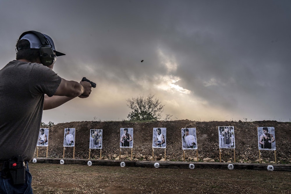 Twice, instructors replace Bob with photo-realistic targets of men pointing guns back at us. The first group stares menacingly at us from across the firing line when we arrive on the fourth day: a sequence of four scumbags repeating down the line. All of them are white. I choose the man in a cream-colored turtleneck and a bad haircut, wanted for crimes of fashion.