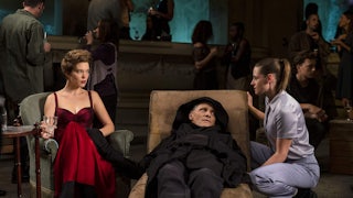 His interests seem more metaphorical. At different turns, Infinity Pool plays like a White Lotus–styled satire of ugly tourists, a critique of hypermasculinity, and a gnostic parable. Jokes about men with olive complexions and Balkan accents donning Manchu costumes while operating a “Chinese” restaurant reflect the broad “multiculturalism” of certain packaged holidays. And the marauding revels of the nihilistic Western tourists are, to a point, exhilarating—in a whooping, ultraviolent, Clockwork Orange kind of way. But by the time we arrive at a blood-soaked Skarsgård sucking at Goth’s (also bloody) breast, it’s unclear what buttons Cronenberg is trying to push.