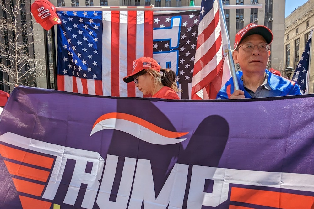 I met her as we stood in a park in lower Manhattan, at the fringe of what the New York Young Republicans Club promoted as a rally to support Donald Trump, who was arraigned today at the courthouse behind us. Diane brushed her yellow-blonde curls off her face, the thin, whippy flagpole in her hand. She’d ordered the flag, she said, and added the slogan herself: “GOD BLESS PRESIDENT TRUMP.” “The white represents Christ’s purity. The blue represents baptismal waters and faithfulness of loyalness of Christ. And the red, of course, the blood of Jesus.” The flag symbolizing the crucifixion, one of which was carried on the House floor on January 6, was flying here during holy week, while Trump at last stood before a judge and was charged with 34 felony counts of falsifying business records.