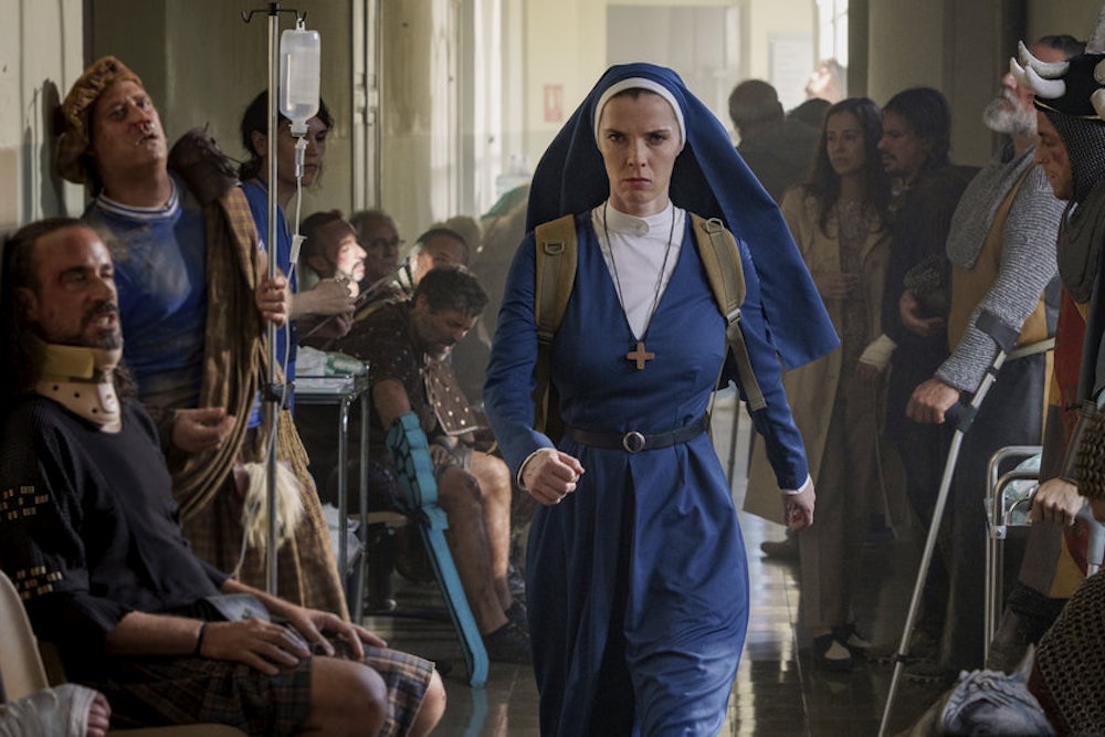 One of the hallmarks of recent Lindelof productions—The Leftovers and Watchmen, specifically—is their ability to pivot deftly between moments of jarring, funny warmth and human insight and moments of horrendous and unbearable grief. Mrs. Davis has taken that formula and replaced the “moments of horrendous and unbearable grief” with It’s a Mad, Mad, Mad, Mad World–style madcap high jinks. One moment, she is sharing a drink with her mother superior (Margo Martindale) in the stables, and the next she is jam-spattered, pursuing the magnifying glass guy in a high-speed chase through the desert. None of this high-wire act would work without Gilpin’s almost athletic ability to sustain both tones at once, to be both hilarious and gutting, to infuse every moment of desperate prayer or laughable farce with deep, human gravitas. It is a startling, stunning performance.