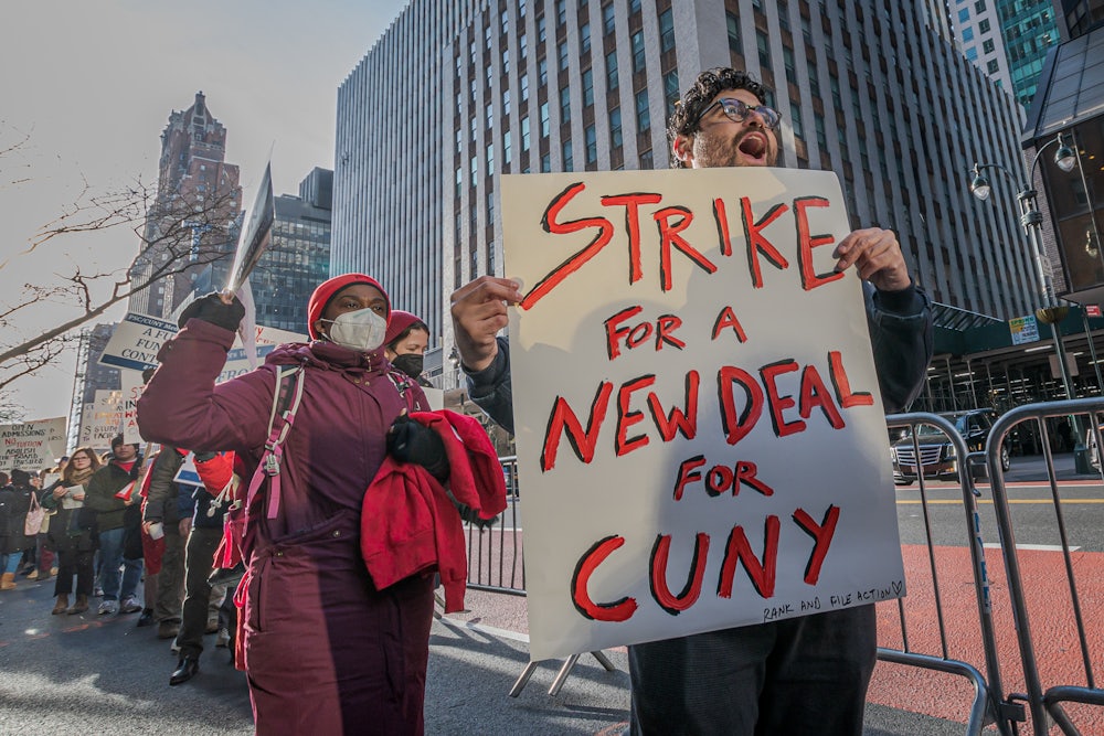 In early May, students, librarians, mental health counselors, adjuncts, and tenured professors gathered in the LaGuardia Performing Arts Center to speak to the City University of New York’s board of trustees. Fresh from a picket line at LaGuardia Community College, those assembled spoke their minds with tones that ranged from temperate to unrestrainedly angry as they testified to the devastating toll that decades of disinvestment has taken on the largest urban university system in the United States. The consequences of this chronic neglect: overstuffed classrooms, meager provision of support and services, poverty wages for faculty and staff, peeling paint and falling debris. Members of PSC-CUNY, the Professional Staff Congress union representing 30,000-some faculty and staff, placed silhouetted signs in empty seats that read “Missing Adjunct,” “Missing Adviser,” and “Missing Student,” a visual symbol of all those who have had to leave the system as a result of unrelenting austerity.