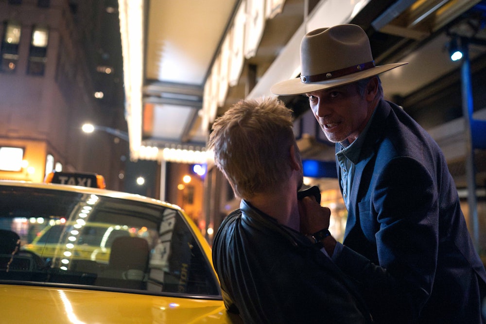 Does that mean this new series is a critique of the racial and gender politics of the original—a reckoning with Raylan Givens as a “problematic” character? Not really. And that’s because Justified is and was always about whiteness, in ways spoken and unspoken. Its six original seasons began with a showdown between the white power of the Marshals Service and the “White Power” of Boyd’s neo-Nazis, and the slippage between those two poles was perhaps the series’ most consistent theme.