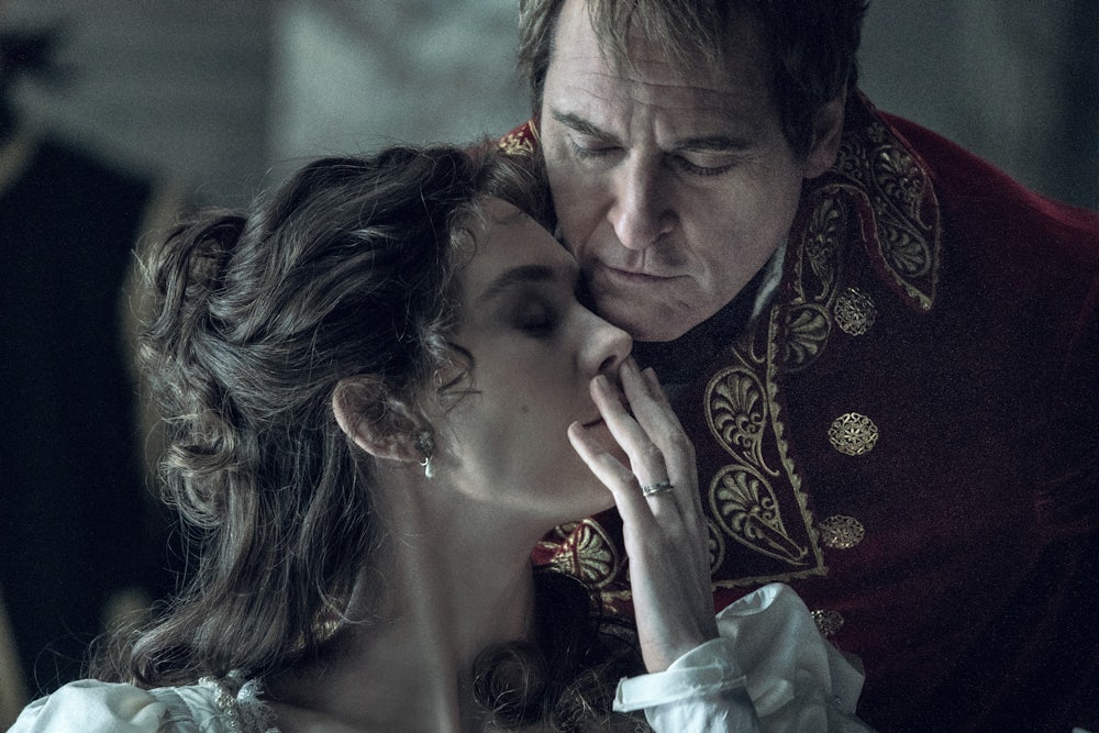 At the very least, Napoleon looks spectacular, like a series of Jacques-Louis David canvases brought to life. Scott whisks us from the guillotines of revolutionary Paris to the pyramids of Egypt, from the abandoned Moscow Kremlin to the remote tropical island of St. Helena, from the icy lakes of Austerlitz to the muddy fields of Waterloo. On one level, this is an adventure movie: We experience the ultimately delusional sense of limitlessness that possessed one of history’s greatest adventurers. If you buy a ticket hoping to see some gorgeously stylized early-nineteenth-century warfare, you’ll get your money’s worth. Meanwhile, everything about the sets, costumes, cinematography, art design, and score suggest a somber Hollywood historical epic, the kind of movie one might expect to contend with Oppenheimer or Killers of the Flower Moon (both of which are superior works of art) for Best Picture in a few months.
