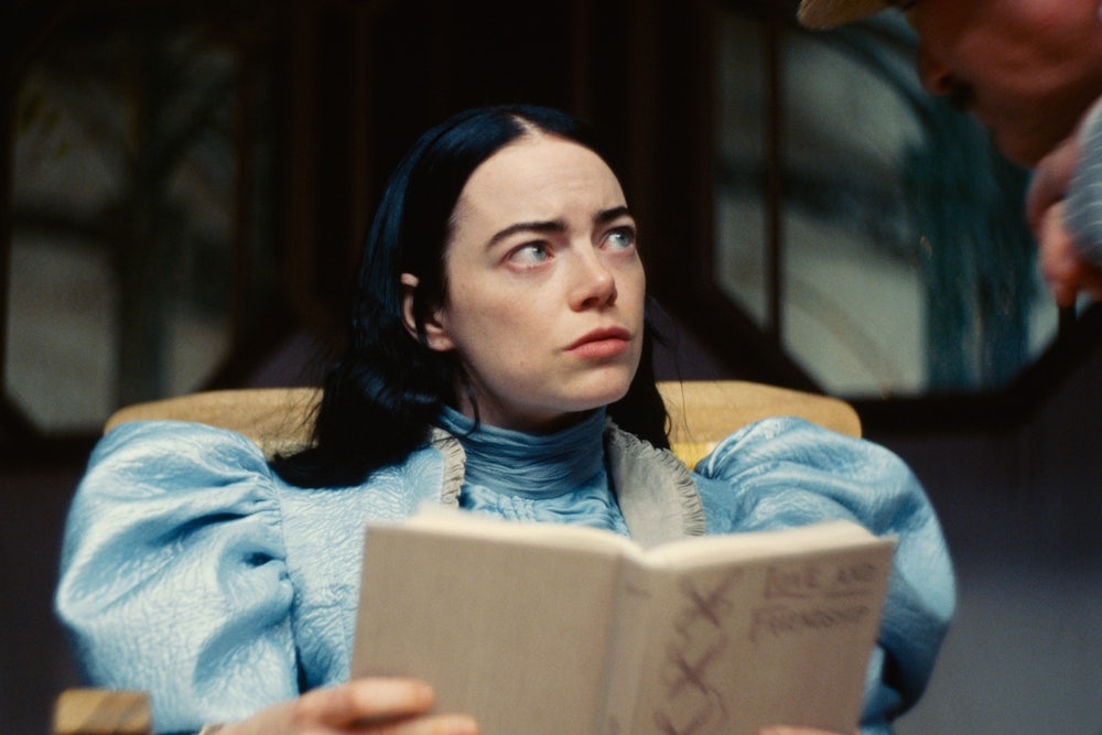 With Poor Things, Lanthimos steps away from suffering’s erosion of the moral and societal fibers and luxuriates, instead, in the productive forces of joy and pleasure. Adapted from the 1992 novel by Alasdair Gray, Poor Things centers on a woman (Emma Stone) who died by suicide while pregnant and has been raised from the dead by Dr. Godwin Baxter (Willem Dafoe), a lonely medical genius with a God complex, daddy issues, and some pretty ugly scars. The woman, christened “Bella,” has her brain replaced with that of her unborn child, given a seemingly permanent reset and, thus, a fresh start. All she has to do is learn how to walk, talk, understand, and express her own emotions, and stop peeing on the floor. The story is about Bella’s journey toward enlightenment, though it is also, to a lesser extent, about the men who love her, who hate her, who want her, who try to trap her, and the blessed few who are happy to sit back and watch her do her thing.