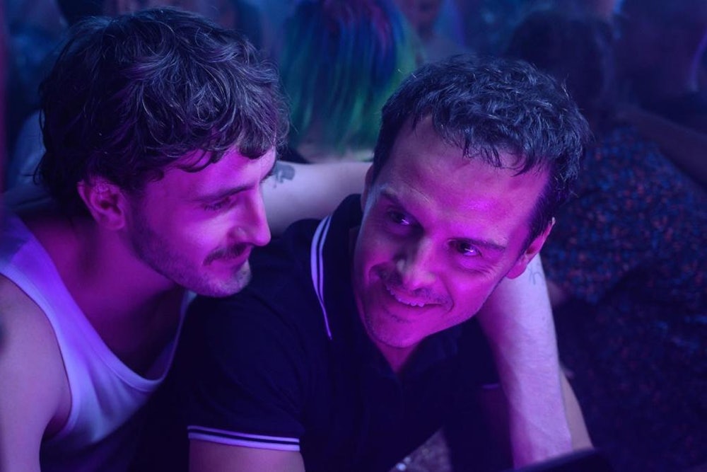 Besides shifting Yamada’s narrative from Tokyo to the outskirts of London, Haigh remaps the story’s psychological terrain. His protagonist, Adam (Andrew Scott), is a gay screenwriter struggling with creative block. He’s seemingly resigned to a weary, watchful middle age on the suburban margins, until he’s suddenly drawn to his apartment-block neighbor, Harry (Paul Mescal). An early shot of Adam gazing up at Harry’s illuminated window somehow suggests both separation and connection; they’re like two points on a lonely modern continuum. As carefully framed by Haigh, they could also be the only two people in the entire world.