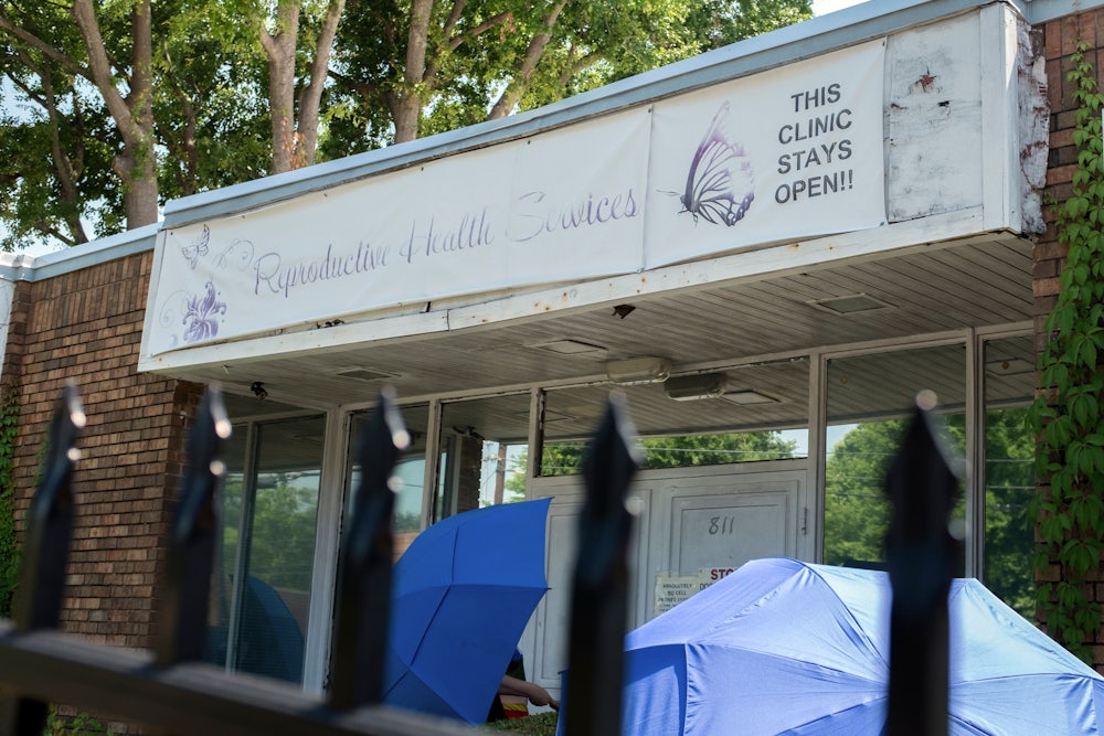 Clinic escorts shield the identity of a woman from anti-abortion protesters entering the Reproductive Health Services building in Montgomery, Alabama, on May 20, 2019.
