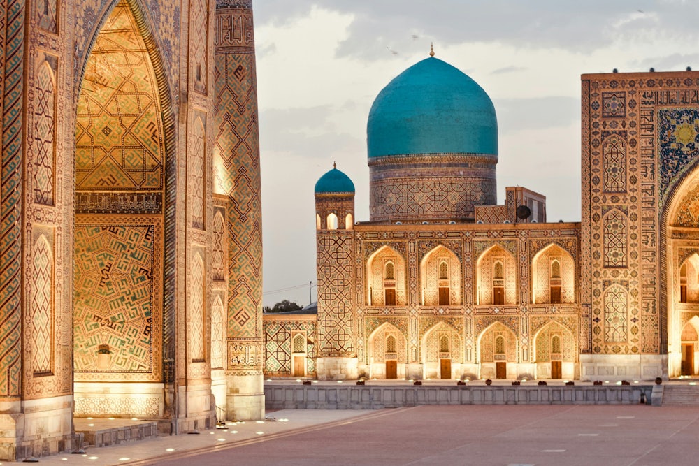 After checking out of the hotel in the morning, board a bullet train to the city of Samarkand, founded in the seventh century BCE. Samarkand derived its commercial importance from its location at the junction of trade routes from China and India.