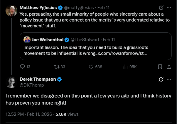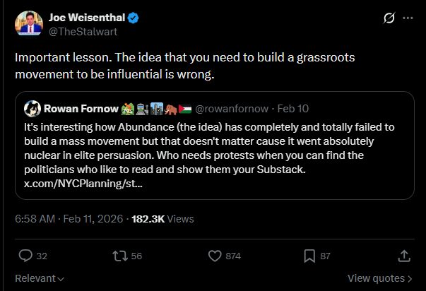 The abundance ecosystem has tried to develop a “grass-tops” movement, which parlays an elite influence campaign into building a mass constituency. Abundance world has certainly been successful at the first part; with hundreds of millions of dollars (this figure is meant literally, not figuratively) flowing into abundance organizations and Klein playing an intellectual power-broker role within Democratic politics—to the point that it raised eyebrows internally at The New York Times, according to reporting from Axios. But with sitting mayors and governors explicitly name-checking the book and its authors, abundance has thoroughly permeated the political class. It has not, however, been as successful at building a broad-base constituency. (It is perhaps difficult to focus on a gauzy future of plenty when fascist shock troops are loose on the streets, acting with impunity.)