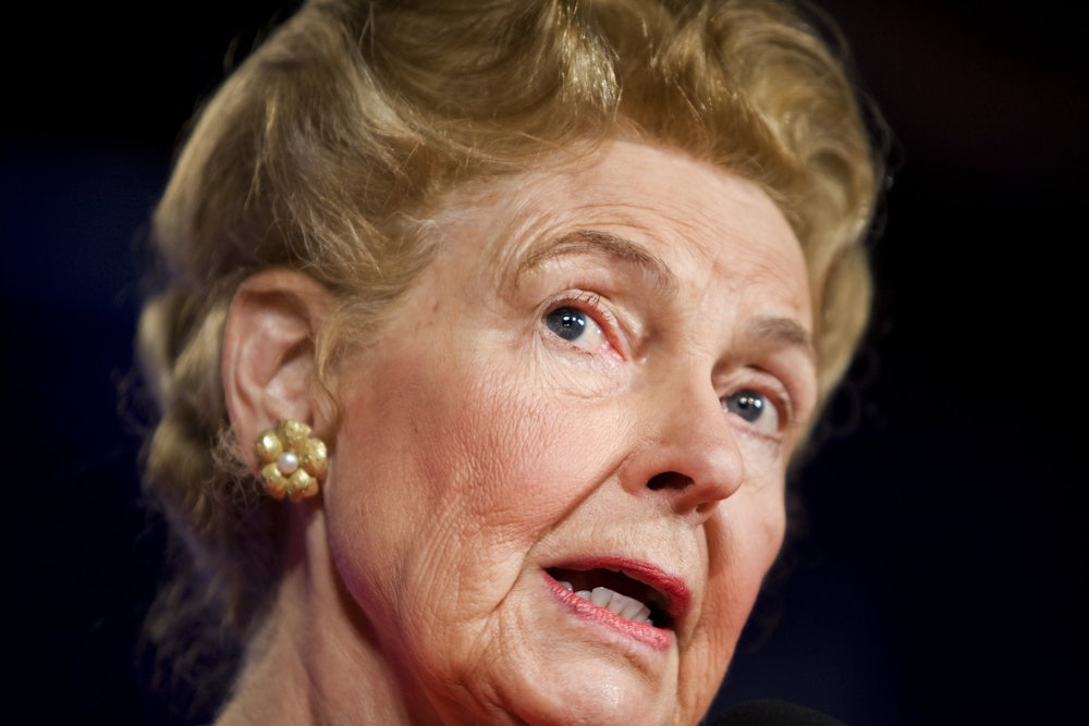 The ugliness of American politics today can be directly traced back to Schlafly’s vituperative, apocalyptic, character-assassinating campaign against the ERA. In Slander, her 2002 contribution to American letters, Ann Coulter described Schlafly as “one of the most accomplished and influential people in America” and “a senior statesman in the Republican Party.” Coulter was right. Karl Rove only perfected what Phyllis Schlafly invented. And the wild, filthy rhetoric of Coulter and some of her screaming reactionary colleagues owes a great deal to Schlafly. We are lucky, come to think of it, that Schlafly flourished in the days before cable.