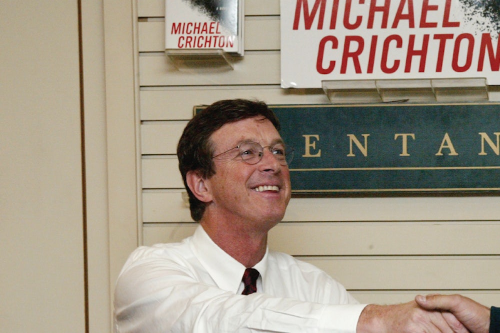 Crichton’s work has found its way into public policy debates in the past. But to judge from this sort of adulation, op-ed columns from the likes of George Will, a White House visit, speaking appearances before the American Enterprise Institute and something called the Washington Center for Complexity and Public Policy, and countless other examples, it seems safe to say that no Crichton novel has matched State of Fear’s effect. And it’s no wonder: State of Fear is by far Crichton’s most aggressive polemic. The book tells the story of environmentalists so determined to hype climate change that they use exotic technology to touch off natural cataclysms (crumbling a massive Arctic glacier, triggering a tsunami, and so on), with a willingness to see innocents die for their cause. According to Crichton, that cause—major limitations on greenhouse gas emissions—is madness. The news media and Hollywood celebrities don’t understand that climate science is wildly imprecise, and, even if you take it seriously, the pro-warming case is overstated. The heroes of the book either understand or come to realize this, and we are meant to follow along with the help of graphs, copious footnotes referencing scientific studies, and long, pedantic exchanges between the characters. To wit, here we find one young global-warming believer stuck on a plane next to the heroic skeptic, John Kenner: