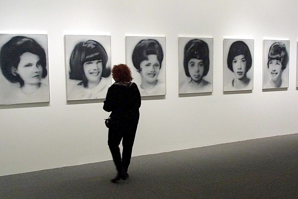 Richter gives us nothing to look at, but the chatter that swarms around his work is full of brain crushers. In the early 1970s Richter created 48 Portraits, a series of black-and-white photorealist renderings of the faces of modern worthies, ranging from Einstein to Stravinsky to Dos Passos to Hindemith. (It also includes artists who seem to have wandered into the twentieth century by accident, such as Puccini.) 48 Portraits, which hangs above a stairway at the Modern, may well be the most visually inert set of canvases ever displayed in this museum. That will seem like a criticism, until you read what Richter says about 48 Portraits: “Those were the typical neutral pictures that one finds in an encyclopedia,” he explains to Storr. “The issue of neutrality was my wish and main concern. And that’s what they were. That made them modern and absolutely contemporary.”