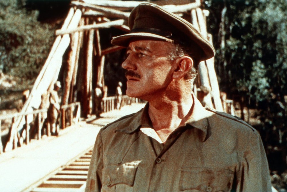 It is as the picture progresses that you become increasingly aware of the complexity—the pathos, the foolishness, the nobility—of the Colonel’s actions. At the beginning, when he and his men have been captured in Thailand by the Japanese he seems merely conscientious. But when he does not submit to the brutality and degradation heaped upon him by the Japanese commander (Sessue Hayakawa), when finally he wins and forces the commander to accept the British officers as officers, then the force and depth of his character begin to appear. He takes over the building of the bridge and the direction of his men; the bridge becomes his Moby Dick.