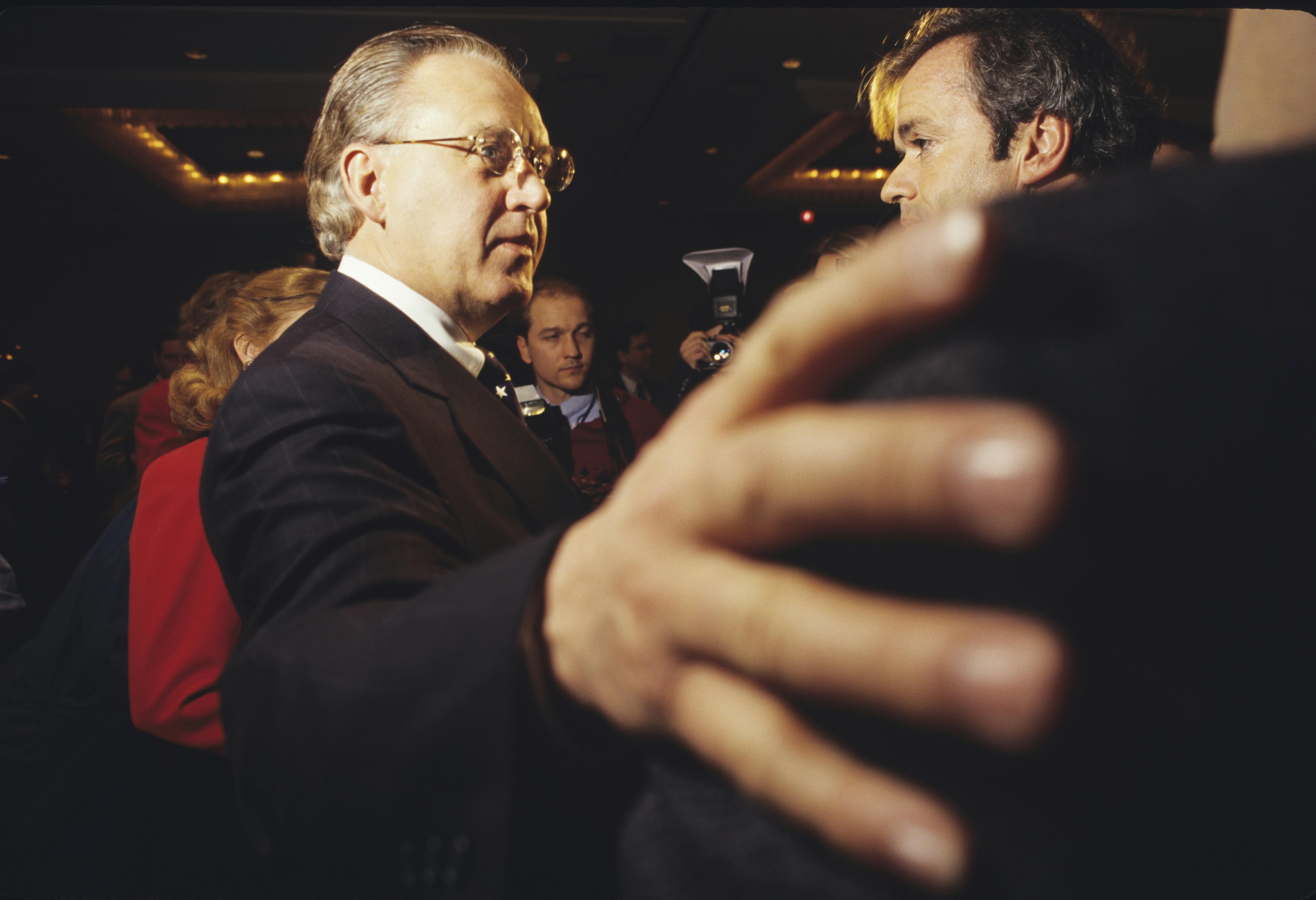 Outside the Des Moines television station there were two chanting mobs of about 200 people divided by a street. One held bright orange signs that said expose the right; the other jabbed signs for Dole, Gramm and Morry. I slid past and into the studio, where I presented myself as attached to the Taylor campaign. They signed me in but did not quite believe me—the woman insisted on walking me down to Morry’s studio. As we entered the back corridor we bumped into Morry on his way to the stage. He’s strutting. Both arms are swinging, and a cluster of six people are failing to keep up with him.