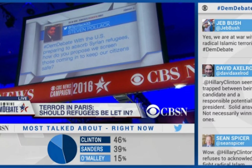 The screen is busy, with three layers, and too many words, and a disorienting diagonal. It’s even worse on the livestream, in which it’s surrounded by tweets and a graphic about “most tweeted issues” or “most tweeted per minute.” That created an absurd moment, just before commercial break, in which a Hillary Clinton tweet in Spanish appeared on screen next to Clinton, as if she were live-tweeting her own performance.