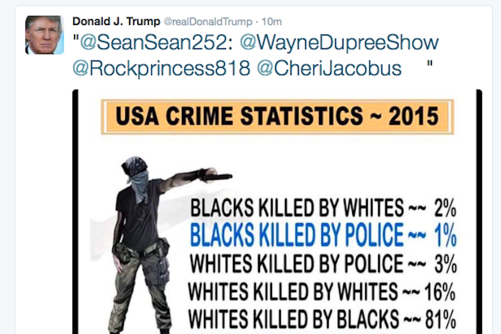 By wildly inflating the likelihood of a murderer of a white person to be black (an exaggeration of nearly sixfold), Trump is catering to the worst sort of racism. Perhaps the icing on the cake of this anti-black outburst is that the source of information cited in the tweet—the “Crime Statistics Bureau” of San Francisco—doesn’t seem to exist. What remains to be seen is if the Republican Party and the other candidates will repudiate this crude and dangerous race-baiting.