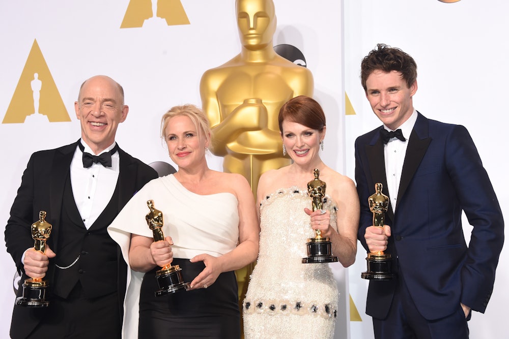 All 20 acting nominees for this year’s Oscars are white, setting up a repeat of last year’s #OscarsSoWhite campaign. (Last year’s awards were the least racially diverse in 17 years.) Before anyone says that this is because there were no good performances by people of color to choose from, let’s just think: Idris Elba in Beasts of No Nation, Michael B. Jordan in Creed (though Sylvester Stallone did get a Supporting Actor nod, plus loud cheers), Samuel L. Jackson in The Hateful Eight, Jason Mitchell in Straight Outta Compton, and Mya Taylor and Kitani Kiki Rodriguez from Tangerine.