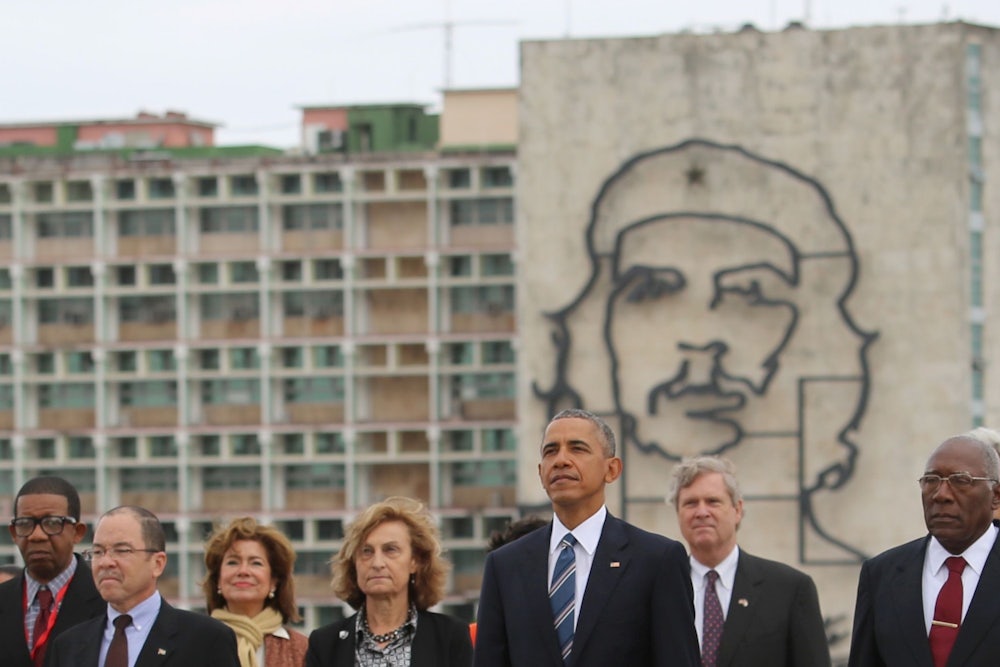 Here is a picture of the president of the United States in front of a massive monument to Che Guevara, aka the right wing’s giddiest nightmare brought to life.