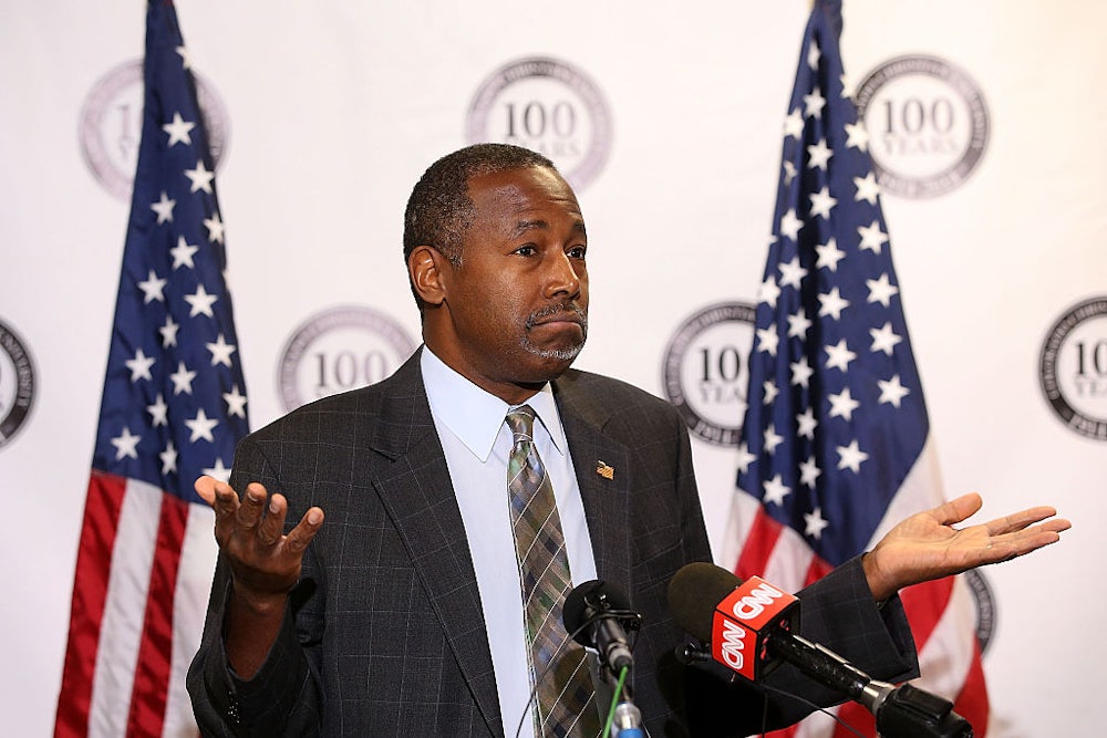Ben Carson is a terrible surrogate for Donald Trump. Since endorsing him for president—possibly after making an illegal quid pro quo agreement—Carson has put his foot in his mouth over and over again. He’s said that Trump has “major defects” as a candidate. He’s said, “There are better people at everything, but what we have to do is we have to utilize what we have.” And he’s said that “even if Donald Trump turns out to be not such a great president,” it won’t be that bad because “we’re only looking at four years.”